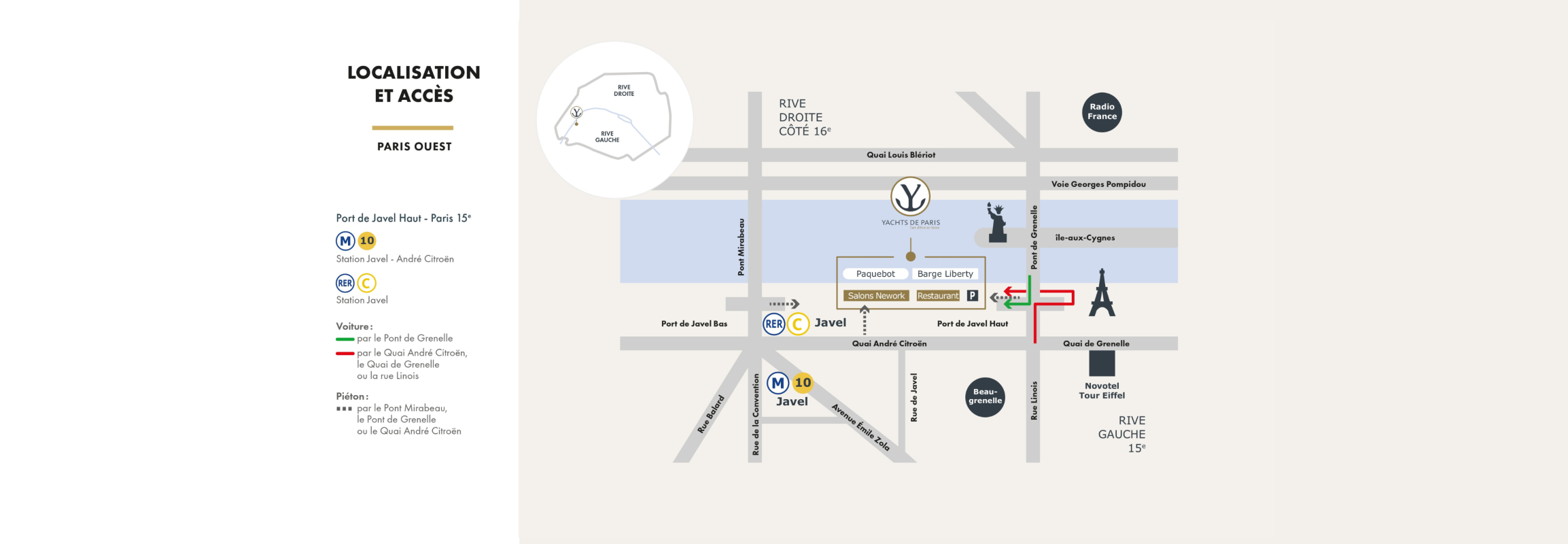 Nous disposons de trois quais parisiens. Ils sont respectivement situés dans l’Ouest et l’Est de la capitale. Cliquez sur chacun d’entre eux pour découvrir comment y accéder et quels Yachts et Salons y sont amarrés.